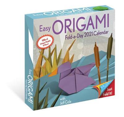 Elk kalenderblad heeft aan de ene kant de datum en een duidelijke handleiding voor het vouwen van een model en aan de achterkant een vrolijk patroon in een felle kleur.
